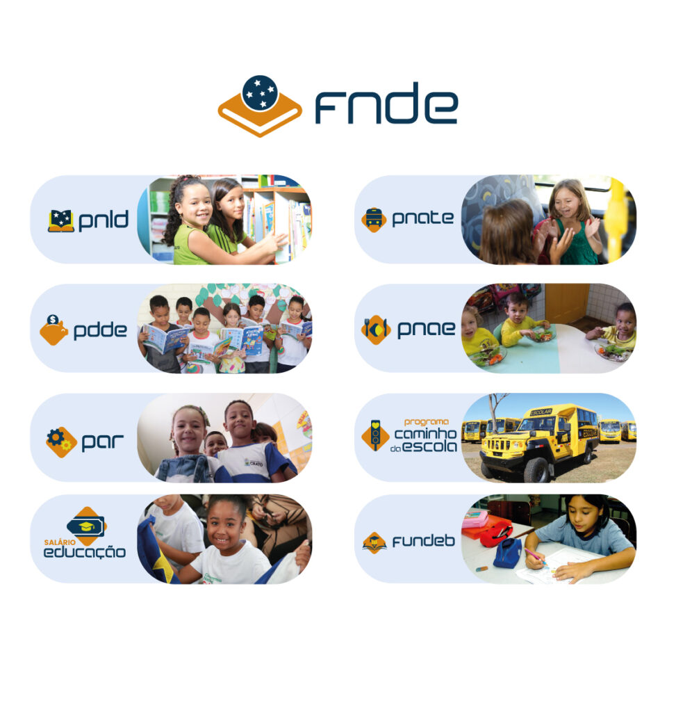 FNDE desenvolve dezenas de ações em todo território nacional com o objetivo de aprimorar, ofertar e democratizar o acesso à educação. A padronização dos ícones dos programas fez parte da criação da nova identidade visual do FNDE, lançada em abril de 2024.