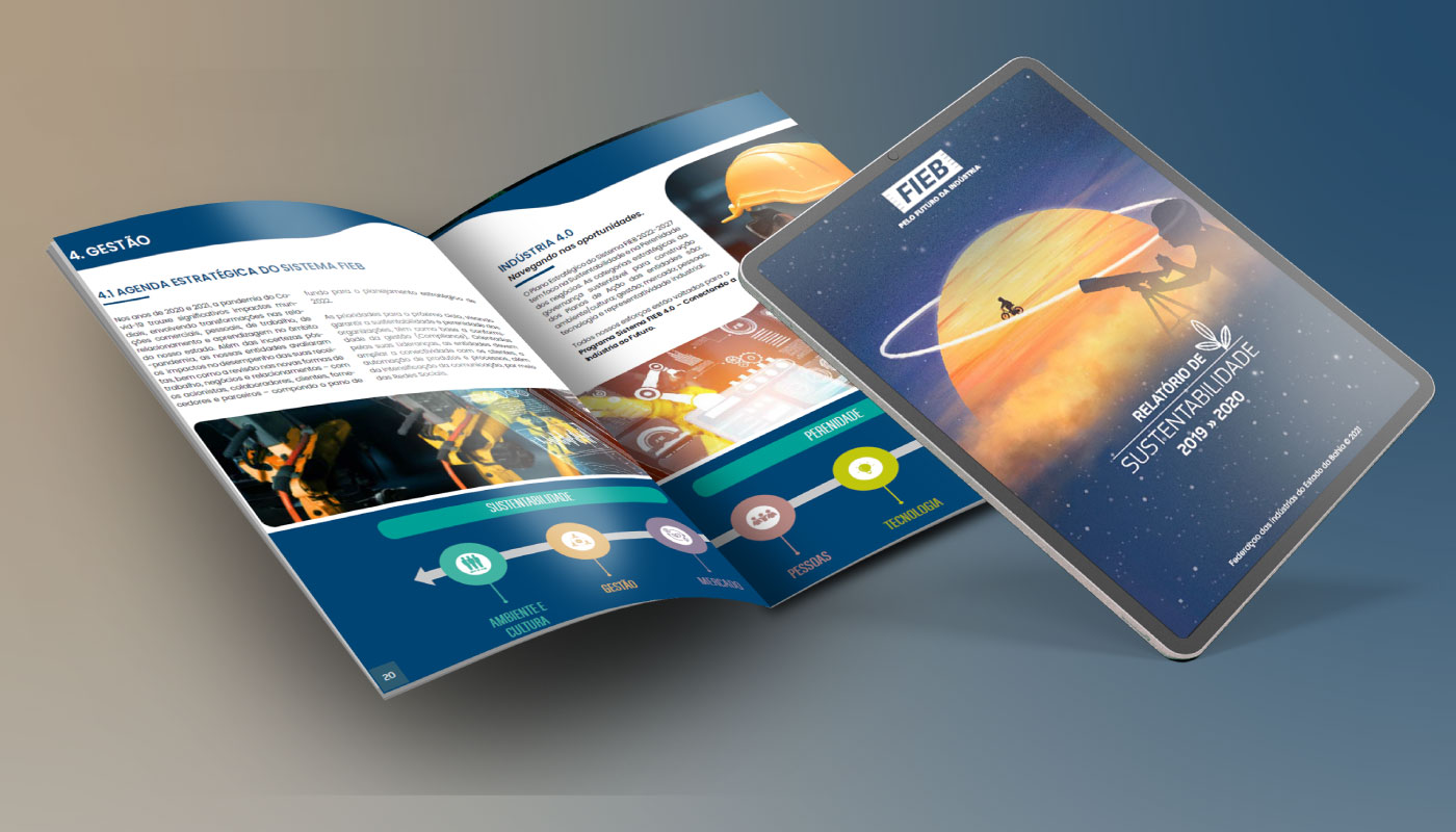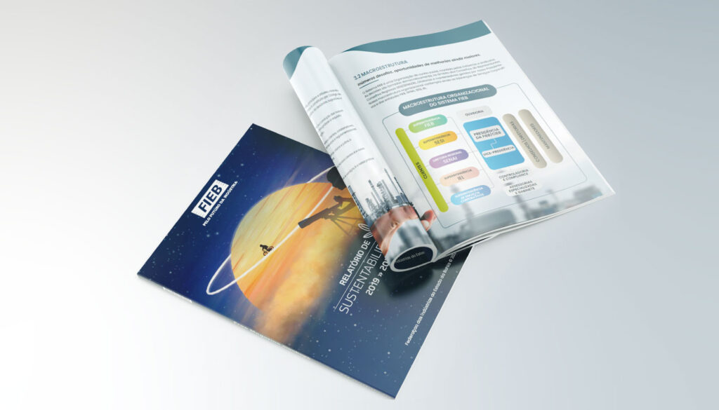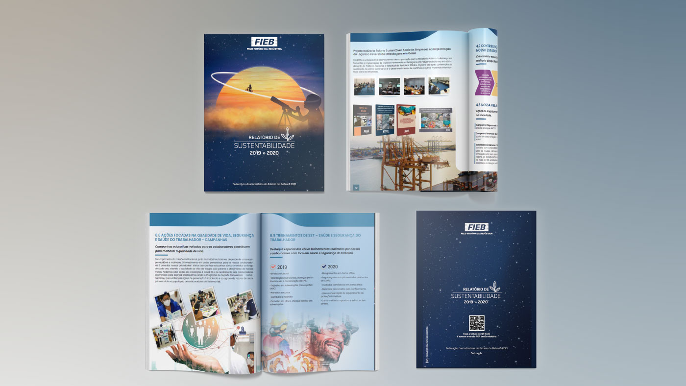 O trabalho incluiu o tratamento detalhado de imagens e uma diagramação minuciosa, transformando dados densos e indicadores complexos em um material fluido e de fácil leitura. O resultado é uma peça de design editorial de alto impacto, que não apenas cumpre seu papel de transparência corporativa, mas reforça o posicionamento de marca da FIEB como referência em desenvolvimento responsável.